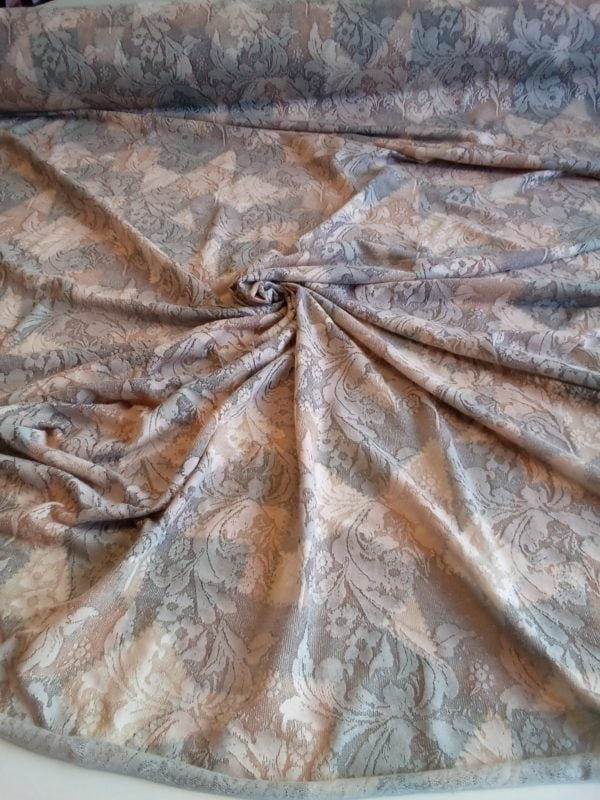 The design is woven through and has a large floral motif in tones of Ecru/ Cream but on an almost block looking background which is similarly made up of varying tones of Taupe/Sand/Sable.