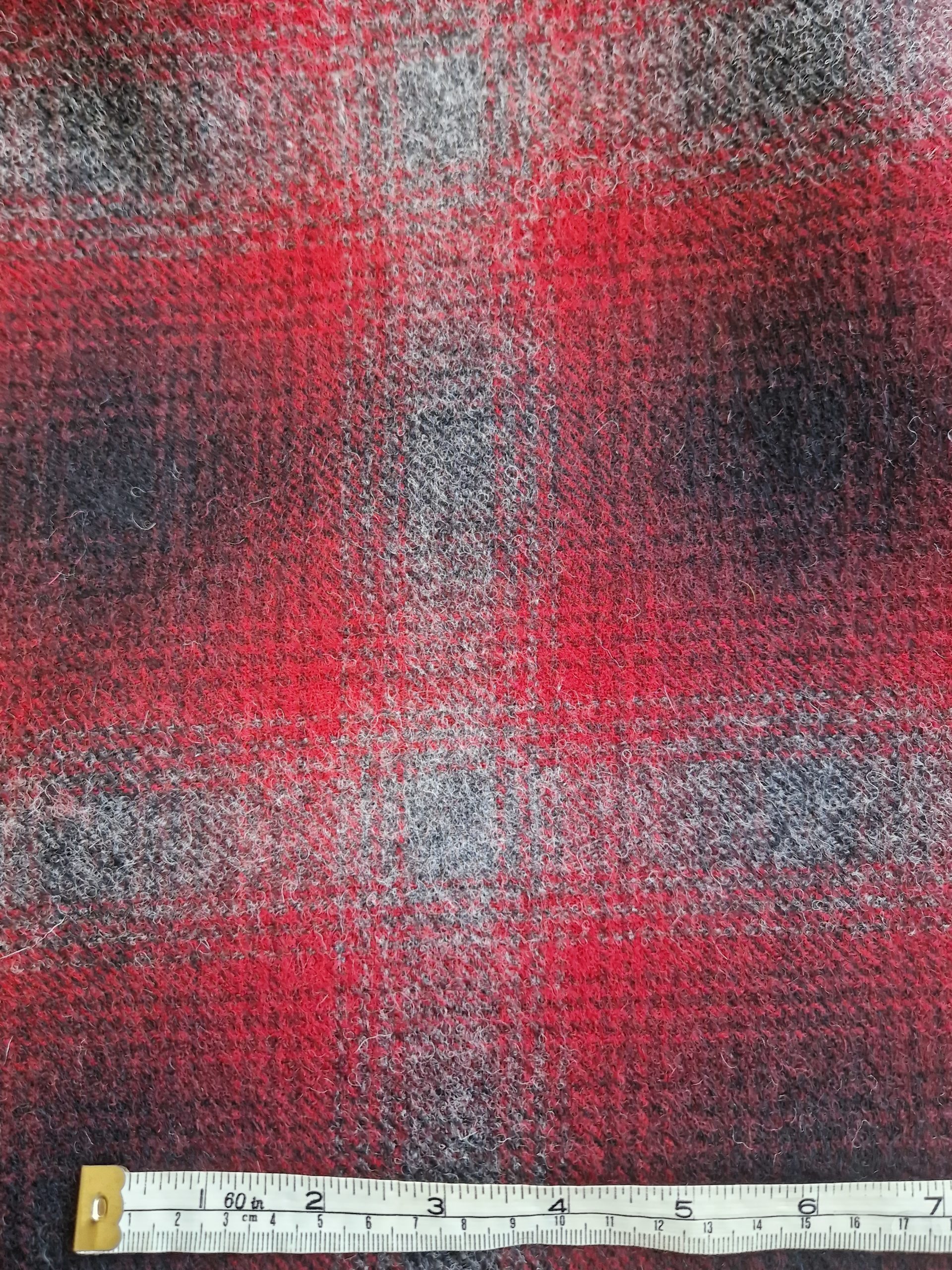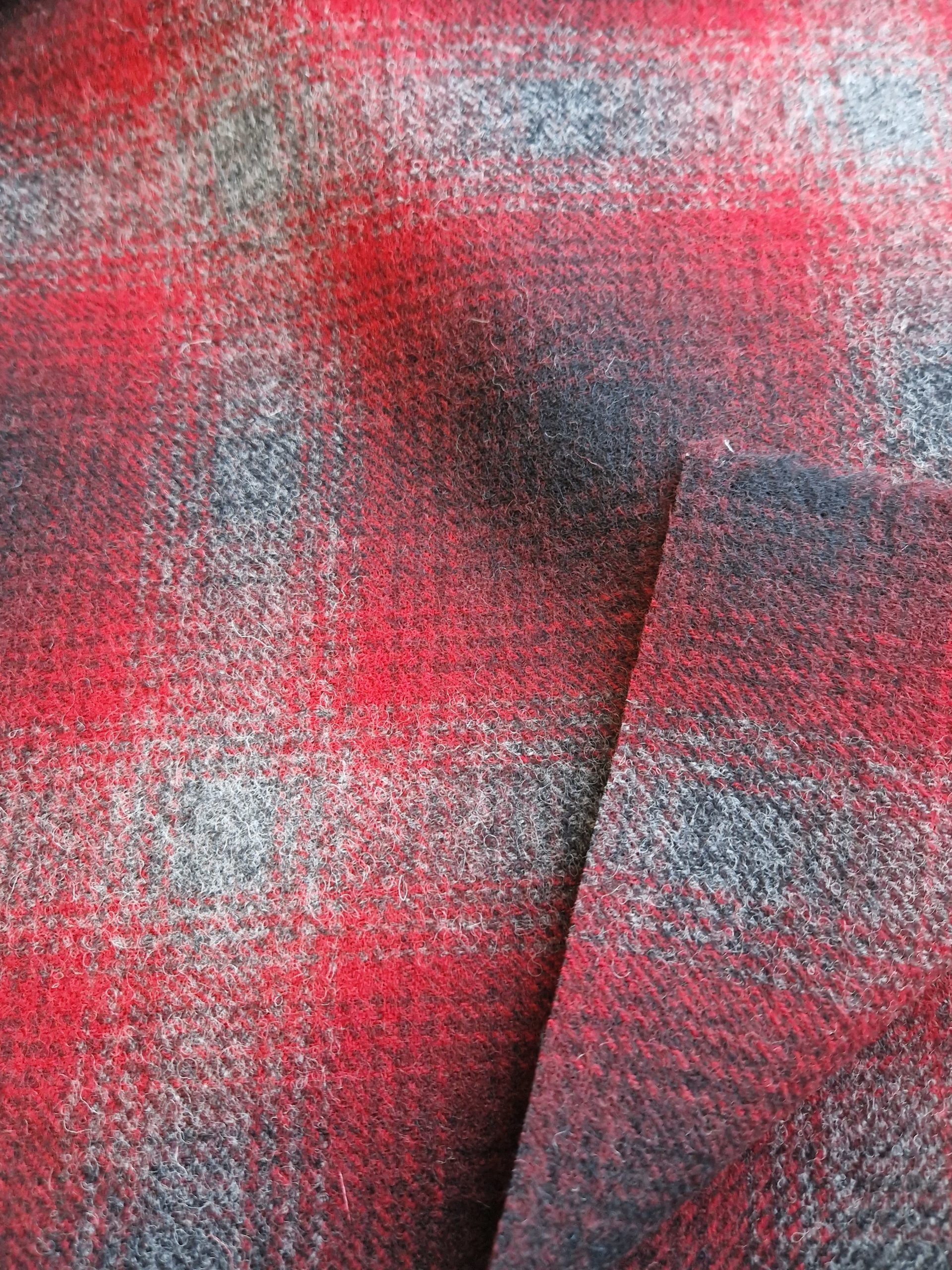 A full bodied beautifully soft wool flannel in the most stunning shades of Claret Wine Gunmetal Grey and Black has a bold large check but because of the colours has a more muted look as the tones merge slightly.