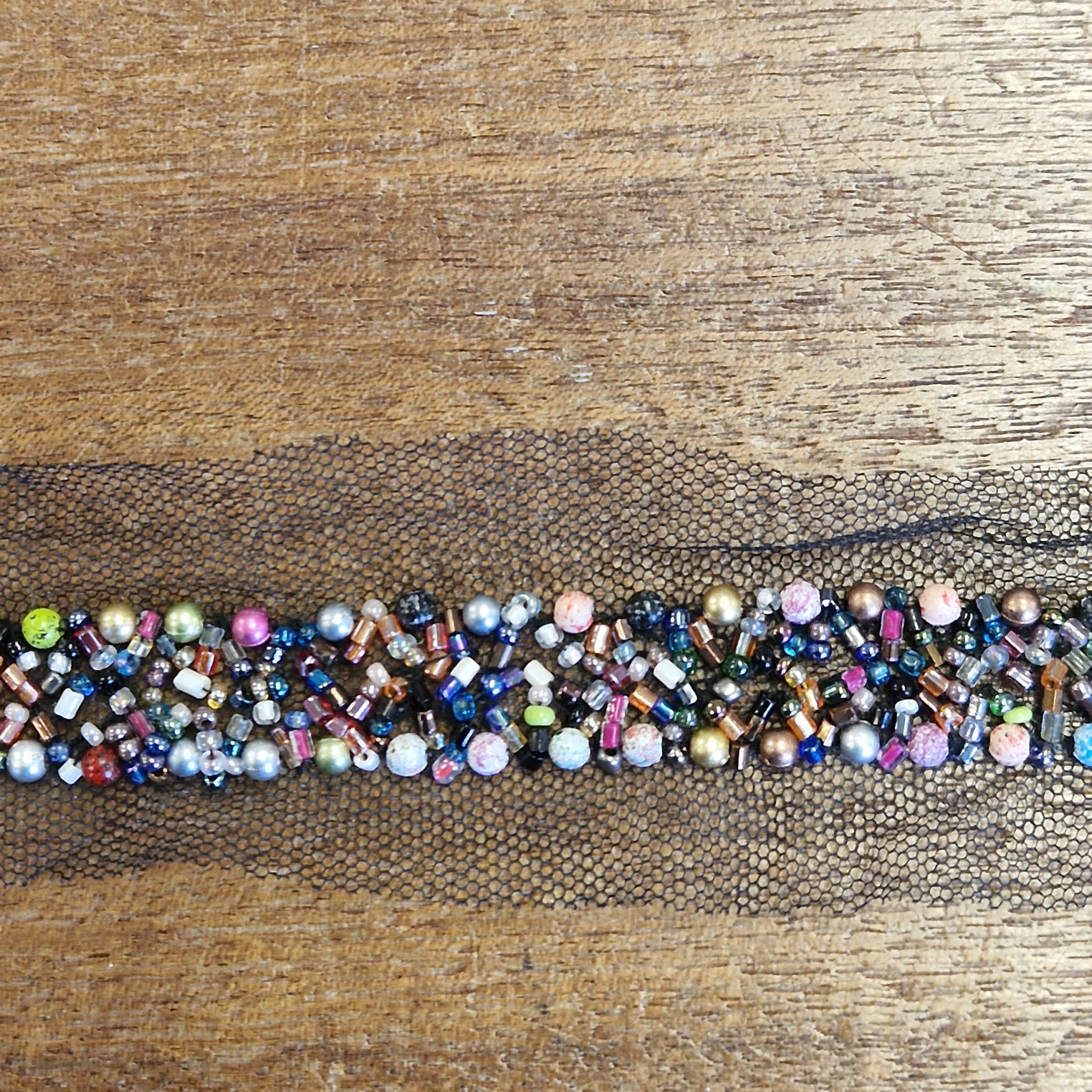 SKU:ST 1656 – 3/4″/19mm, Seed/ bugle beaded heavy straight edged trim on a mesh ground Multi beaded in multi colours.