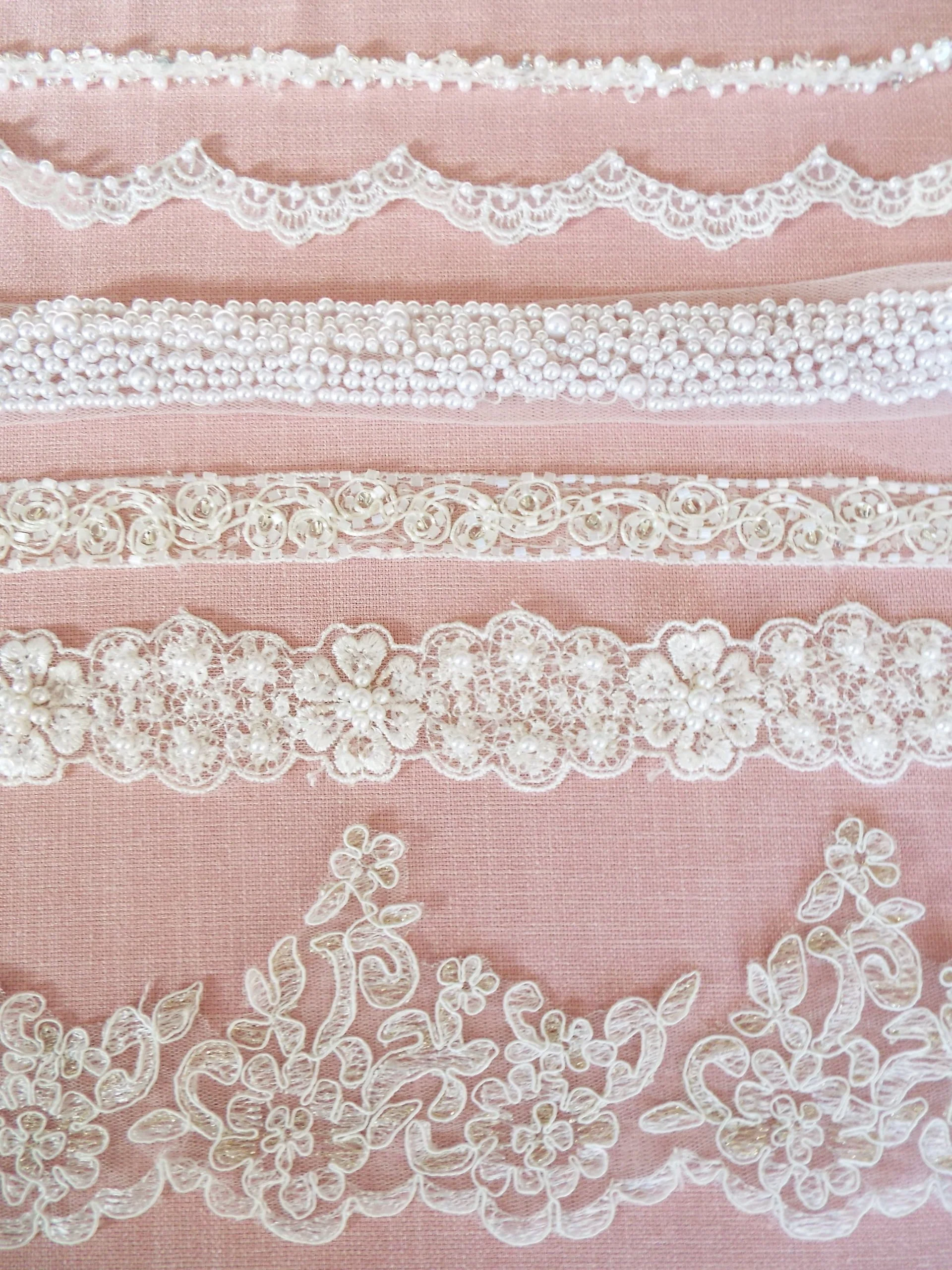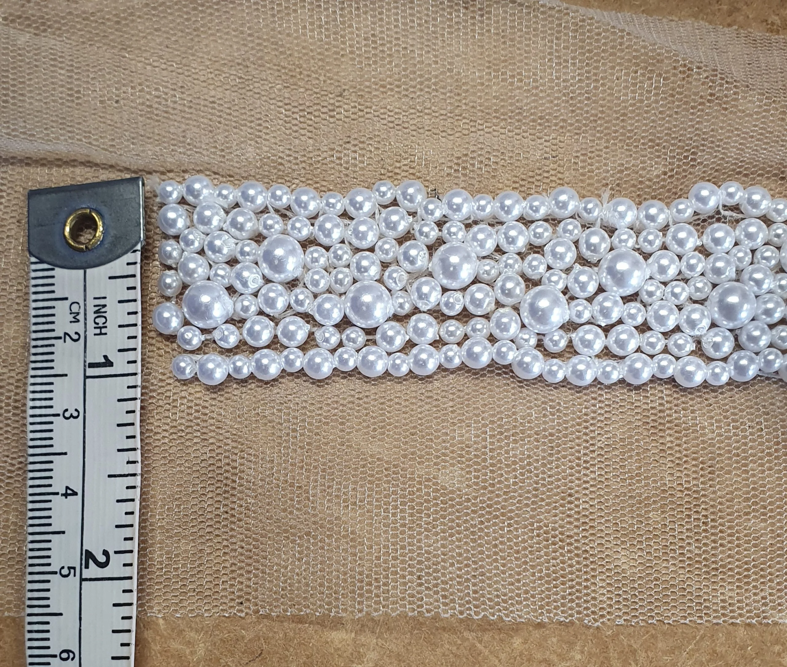 B73 T30 – 1.2″/29mm Heavy encrusted pearl trim on tulle base Pearl only ( a slightly brighter Bridal White Parchment shade)