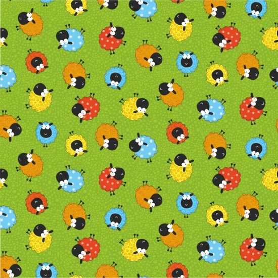 Cute fun cotton fabric by Nutex in Bright Green ground with assorted ‘Happy Sheep’.
