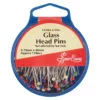 Extra long nickel plated steel pins with Yellow glass heads. Heads not affected by a hot iron.
