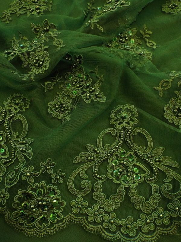 An exquisite and heavily beaded and sequinned lace tulle in a fabulous deep rich Bottle Green, co-ordinates with 2562 Bootle, 5251 Autumn Forest etc.