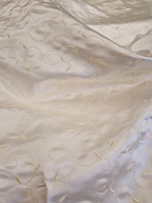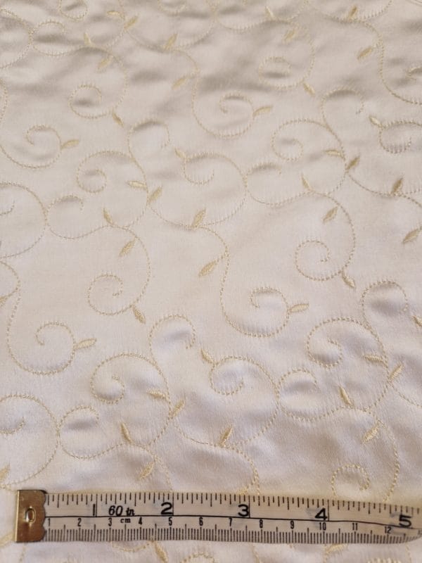 Beautifully weighted polyester embroidered duchess satin. A tight small swirl of Ivory on Ivory Satin.