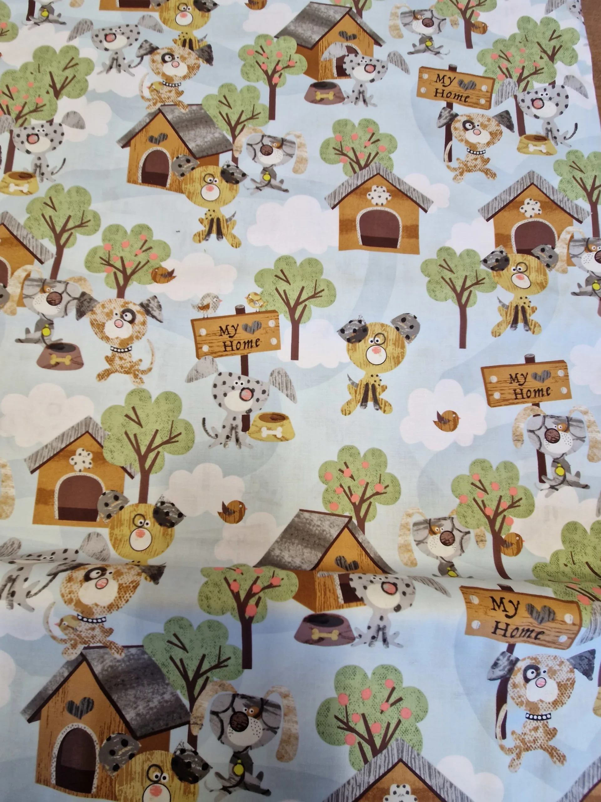 There are 2 lovely co-ordinating fabrics to go with an animal infused design, a multi sized panel (40cms x 110cm, 16″ x 44″) that would be good for cushions or added to the size of the original panel and an allover doggie design.
