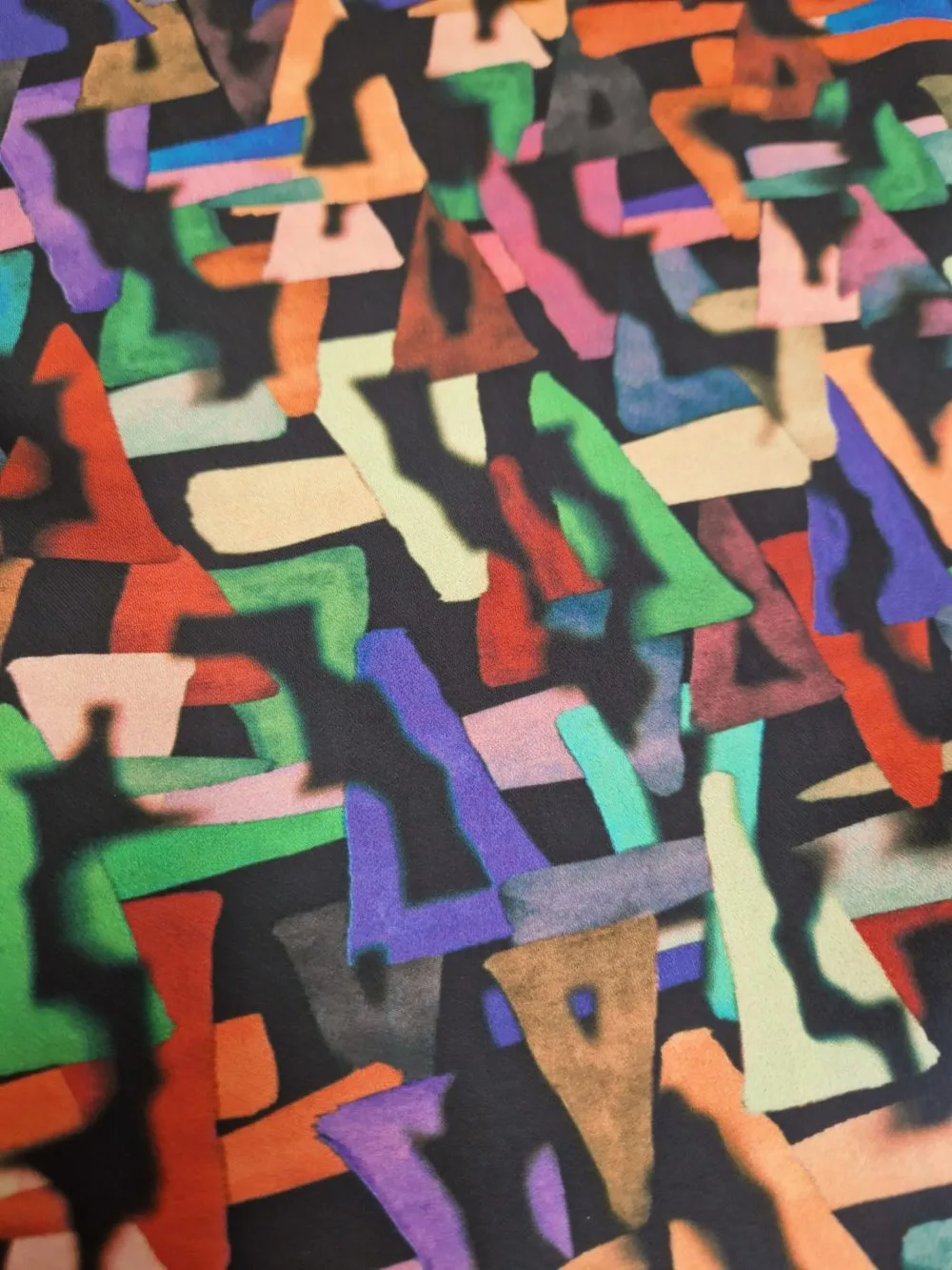 This fabric features a bold and abstract pattern with overlapping geometric shapes, primarily composed of angular, block-like forms in a wide range of vivid colours- red, green, purple, orange, blue and cream against a dark background. The overall effect is vibrant and dynamic with some areas of a shadowy, almost airbrushed appearance that adds depth and a sense of movement in the fabric.