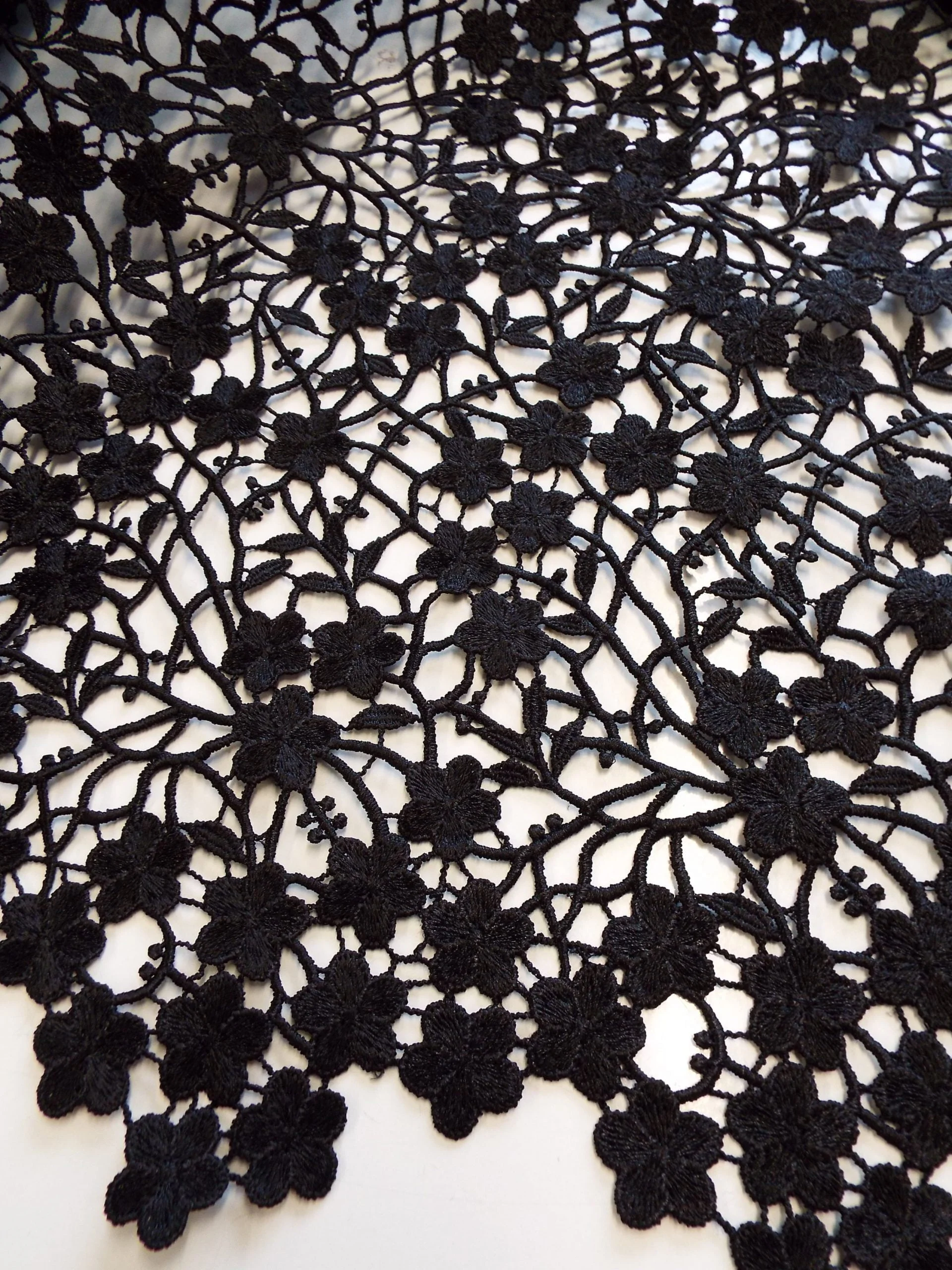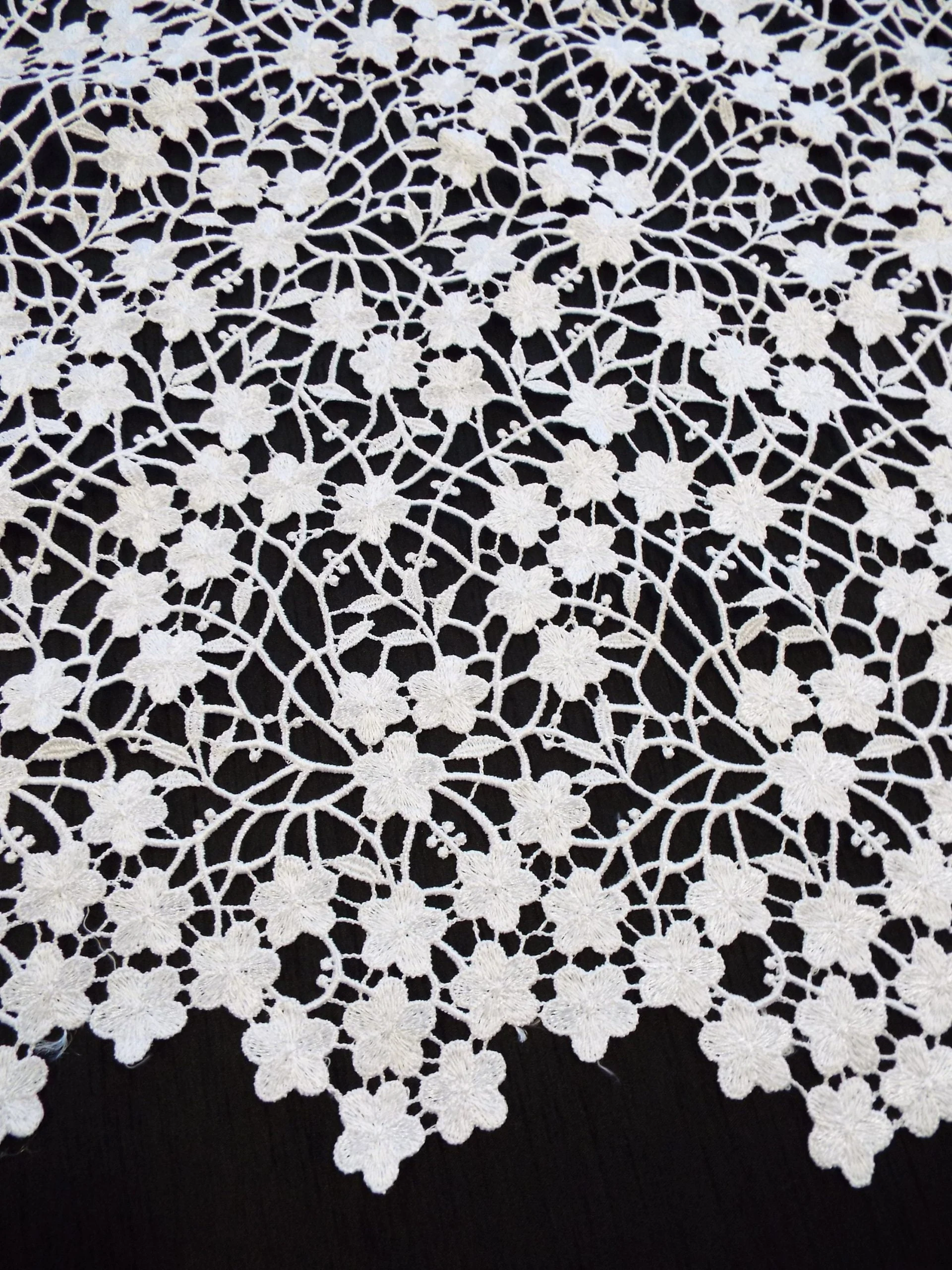This lace has a number of designs throughout the range, this item is a ‘spider’s web’ of embroidered heavier guipure linked together into a mesh design.