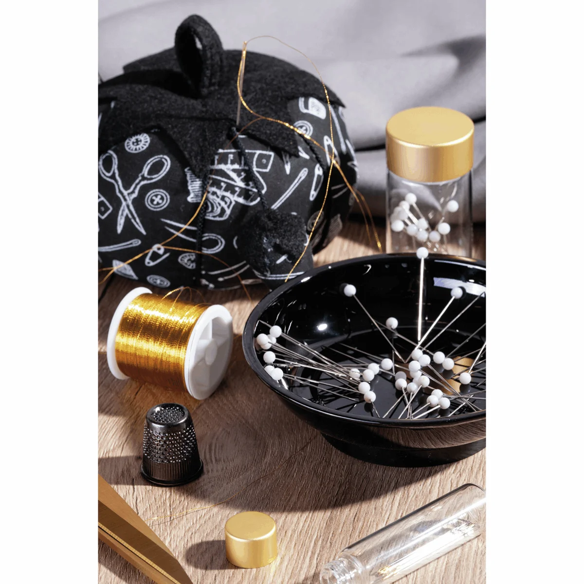 Premium tomato style pincushion handcrafted in the Hemline Gold signature print.