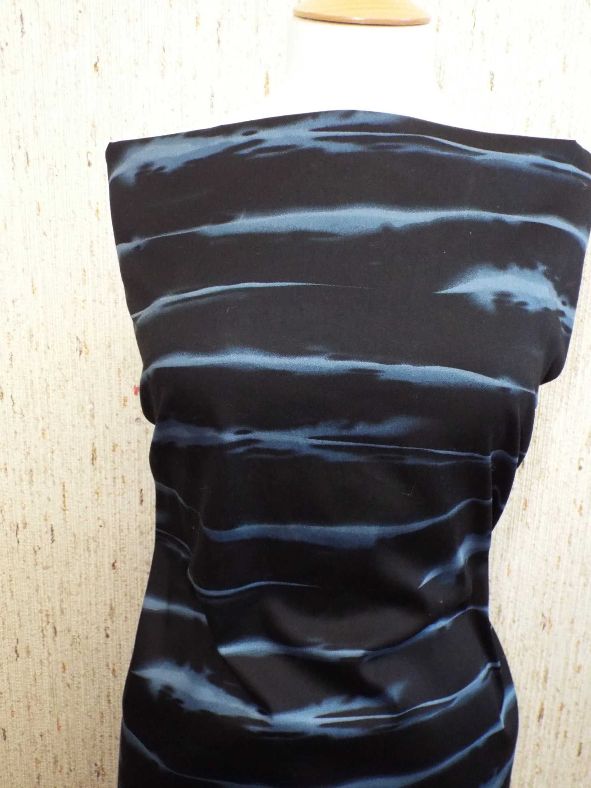 A crisp poplin weight, with an abstract water effect design. Horizontal print across the weave has a lovely ‘Midnight Wave’ 2 tone effect.