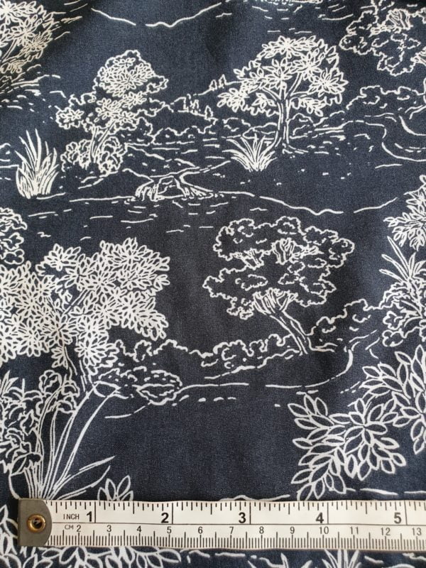 A more conversational print which has an almost French Toile look of Shrubbery. An imprinted Off White shade onto an Indigo- Grey tint of a background.