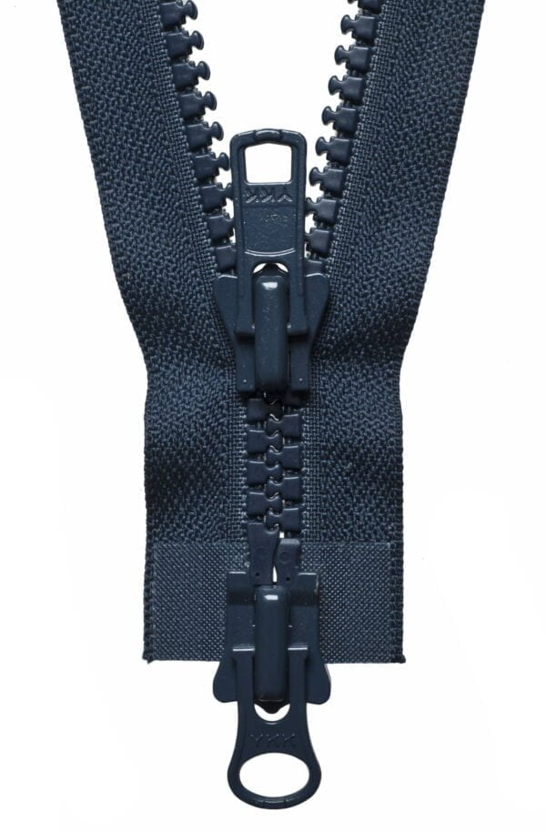 Heavy-weight moulded tooth zip with moveable heavy bottom slider. Allows zip to be opened from both the top and bottom.