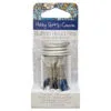 Plastic head pins in a rosette wheel holder with woodblock Arts & Crafts inspired printed centre design. 40 pins included in a rich blue colour. In plastic free hang-sell packaging with coordinated packaging design. Each pin size: (diam/l) 0.60 x 34mm. Wheel size: (diam/h) 8 x 0.4cm.