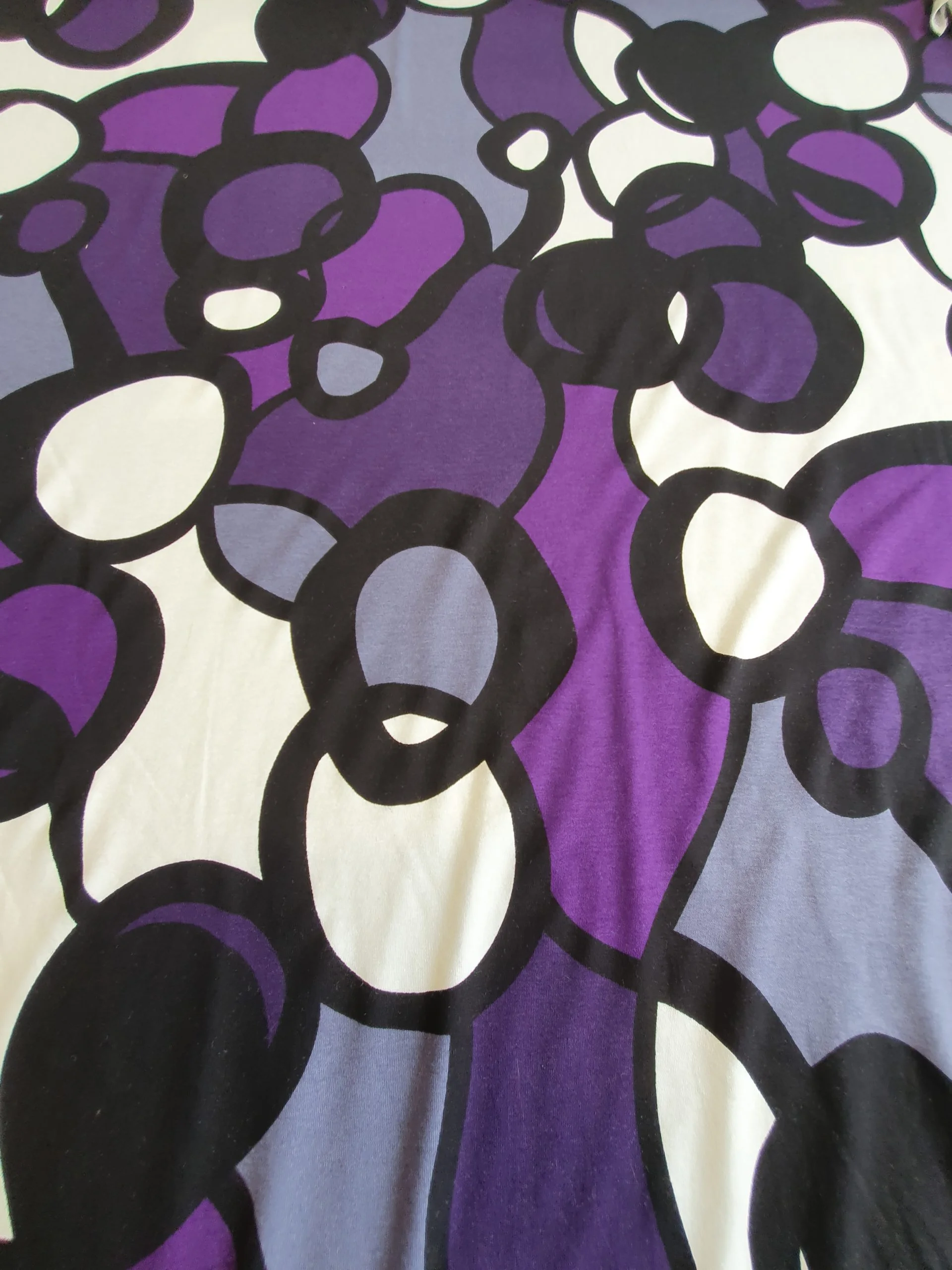 Big Bold abstract design. Has a Psychedelic type design mixture of Purple/Aubergine/Black/Natural tones.