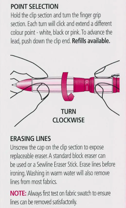 With a unique 360 degree rotating mechanism, Sewline’s Trio chalk pencil comes with 3 colored lead pencil points – white, pink and grey.