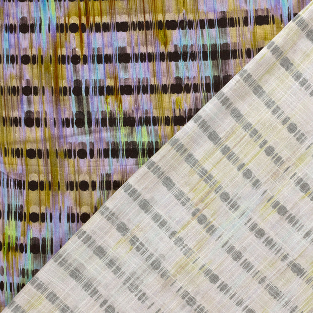 A beautifully multi coloured fabric in a quality abstract styled print in neither too heavy or too light in weight fabric.